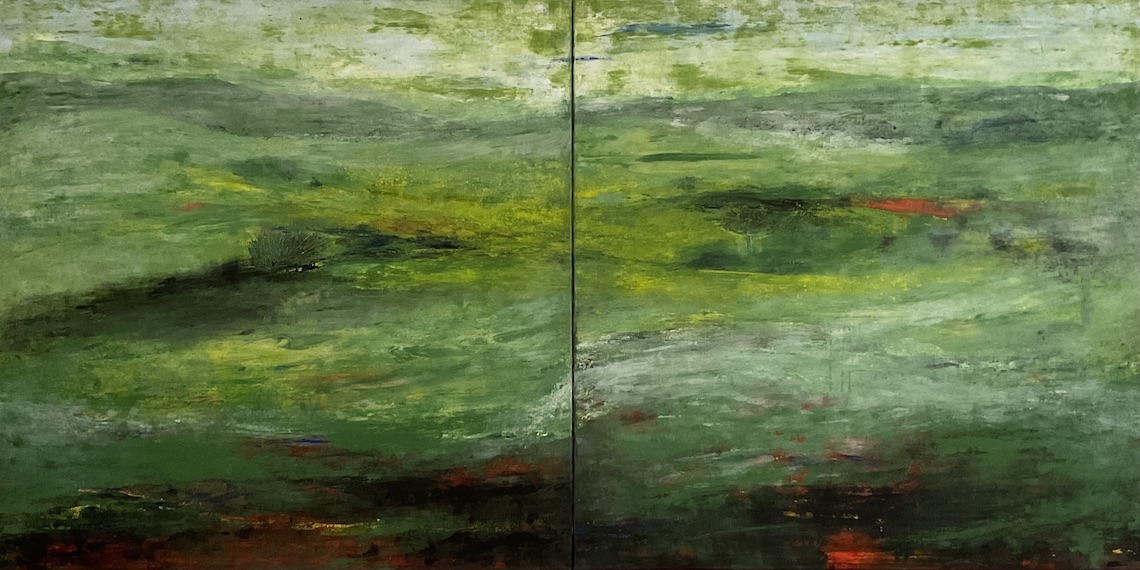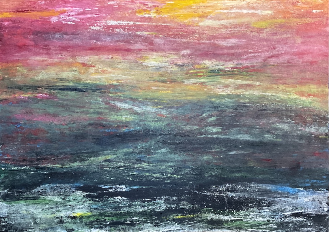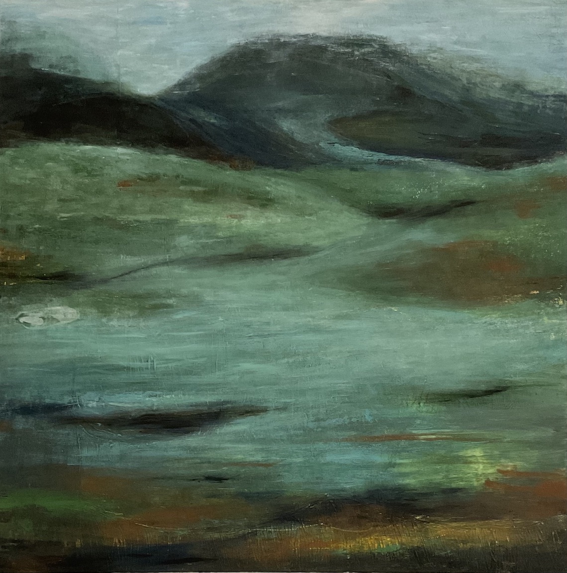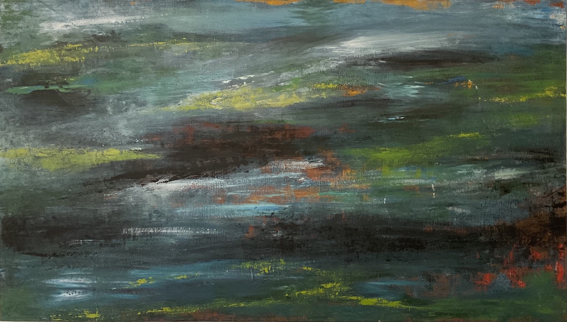 In meinen Landschaften spielt das Experimentieren mit Zufallstechniken und Farbschichtungen eine große Rolle. Die Formen und Farben verlieren ihre gegenständliche Bindung und verselbständigen sich. Die Farbflächen / -flecken /-schlieren, gelegentlich auch Kratzspuren lassen sich zwar als landschaftliche Elemente deuten, zumind. ist oft so etwas wie ein Horizont erkennbar, jedoch sind es eigentlich bloße Projektionen des Betrachters, wenn er darin eine Wasserfläche, die den Himmel reflektiert, oder ein dramatisches Wolkenspiel entdeckt.